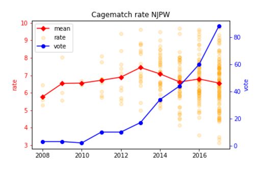 常々新日本プロレスにおいては公式サイトの試合結果のスクレイピングで毎月の観客動員、大会数については定期的に報告しているんですが、それだとどうしても昔のデータは遡れない・・・ということでドイツのプロレスデータベースであるCagematchをスクレイピ…