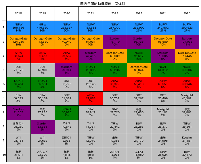 最後に団体別の結果として2018~2025年の団体別の上位10団体をまとめたのが上図になり、2025年の上位5団体については色付けをしています。1位は新日本プロレスで25万523人、2位はスターダムで10万4033人、3位はドラゴンゲートで7万8445人、4位はプロレスリングノアで6万9006人、5位は全日本プロレスで6万946人でした。変動があったのは2位・3位のスターダムとドラゴンゲートで、ドラゴンゲートは昨年から1.5万人ほどの減少、スターダムは逆に2万人弱の増加を経て(おそらく)団体初の10万人超えの動員を達成しています。スターダムに関しては昨年、新団体・マリーゴールドの設立もあって動員が凹んだ節がありましたが、今年はV字回復してました。その対抗となったマリーゴールドに関しては5月からの活動開始だった2024年と比較して通年の活動となった2025年は動員を増やして6位にランクアップしています(平均動員についてはあまり変わらず)。